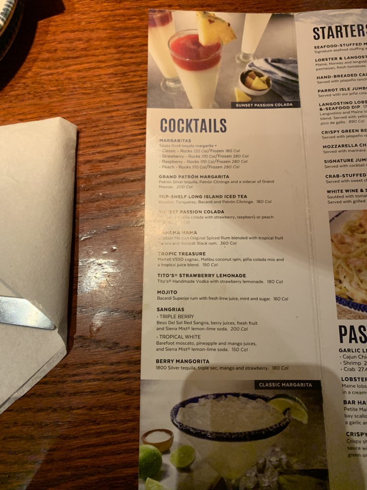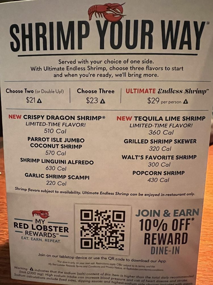 Walt's Favorite Shrimp (260 cal), Grilled Shrimp (250 cal), Garlic Shrimp Scampi (220 cal), Parrot Isle Jumbo Coconut Shrimp (470 cal), Shrimp Linguini Alfredo (620 cal)