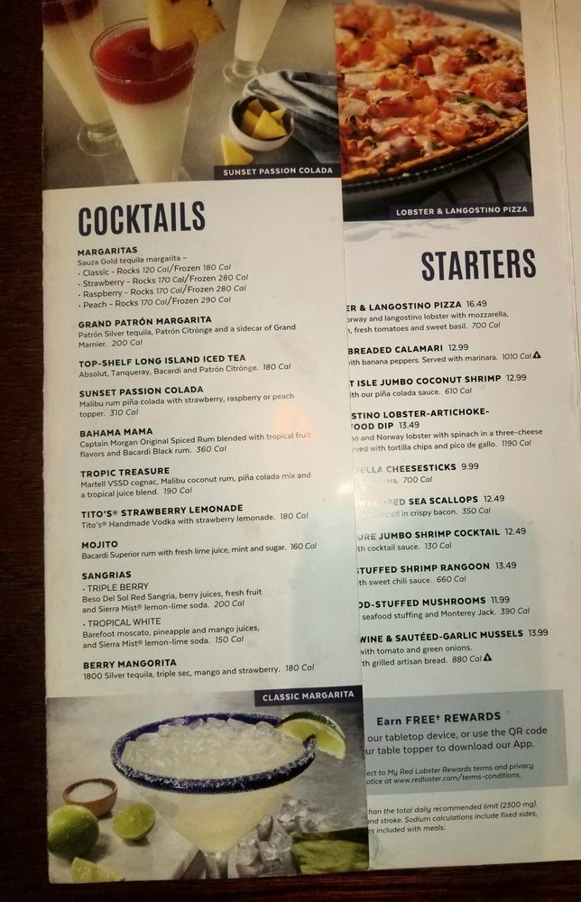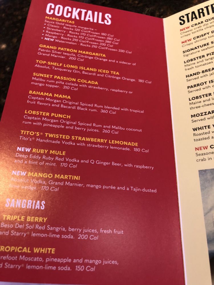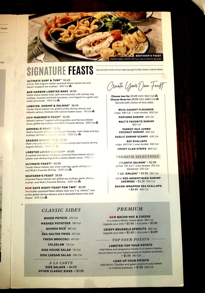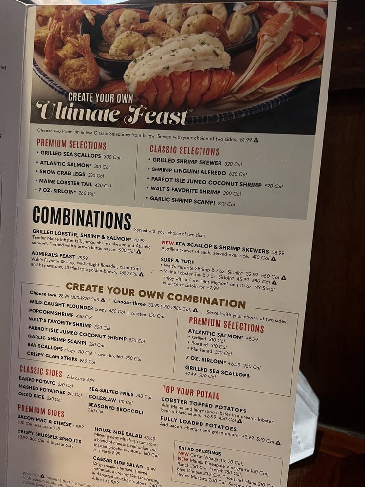 Snow Crab Legs (380 cal), Grilled Sea Scallops (280 cal), Maine Lobster Tail (420 cal), Atlantic Salmon* (510 cal), 7 oz. Sirloin* (320 cal)