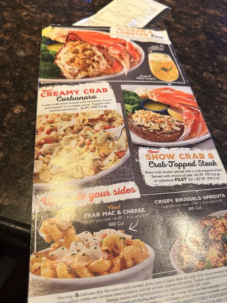 A pound of snow crab legs, served over our crispy potatoes with a choice of one side. Choose Your Flavor: Simply Steamed (300 cal), Roasted Garlic Butter (860 cal), Cajun Butter (650 cal)